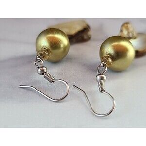 These are a vintage pair of green and tan shell beaded dangling pierced earrings set in a silver tone metal.