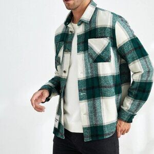 Green And White Casual Mens Plaid Print Letter Patched Double Pocket Overcoat