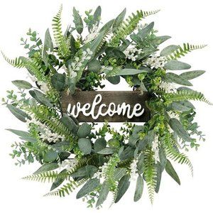 Green Artificial Eucalyptus Wreath with Welcome Sign 20in Mixed White Berries