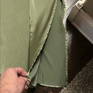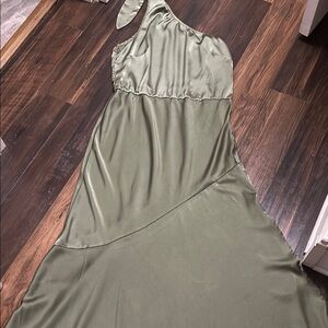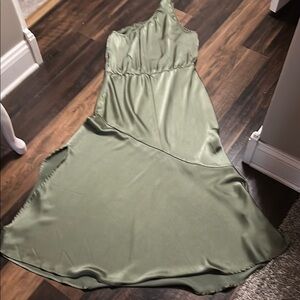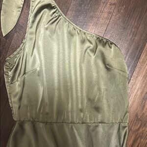 This stunning green dress features an asymmetrical one-shoulder design with elegant ruffle detailing. Perfect for a cocktail event, its sleeveless style and flowing silhouette create a chic and sophisticated look. The soft fabric drapes beautifully, making it a comfortable yet stylish choice for a night out.