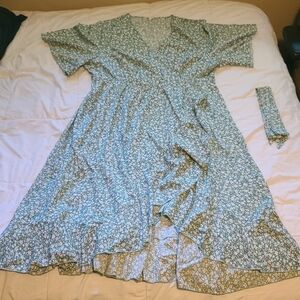 This elegant green sundress features an asymmetrical ruffled hem and a flattering wrap design with a tie front. The short flutter sleeves and V-neckline add a touch of romance, making it perfect for a wedding guest or cocktail occasion.