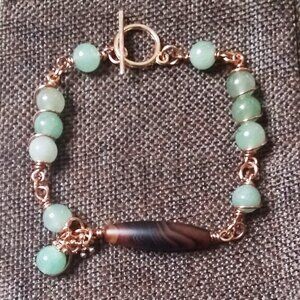 Unique + one-of-a-kind - it features a brown Banded Agate Drum Bead + wire wrapped Green Aventurine Beads. I used bright copper jewelry wire to capture and embellish the Aventurine beads and added a simple copper toggle clasp for easy closure. An extra Aventurine charm bead + a dangling copper daisy spacer add a touch of feminine girlie vibes to this bracelet. I made this to fit a slightly larger wrist - it will comfortably accommodate a 7.25 - 7.75" wrist size.