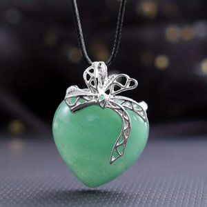 Green Aventurine Natural Gemstone Love Heart Bow Knot Pendant Necklace Gemstone
