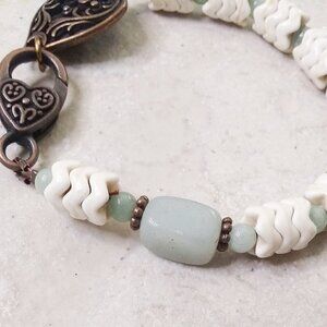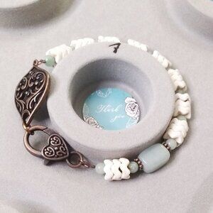This chunky, yet feminine bracelet is heavily embellished with a heavy ornate copper connector and the matching oversized clasp. Due to the large size of some of the components, this is a fairly thick & substantial bracelet and comfortably fits a 6.5-7" wrist.