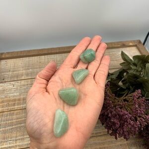 Description: Loose, natural, tumbled aventurine crystal nuggets. The shape of the stones is irregular, and the color varies from light to darker green. The stones are very smooth and look beautiful.