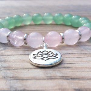 Green Aventurine bracelet with Lotus charm, Rose Quartz, Healing bracelet
