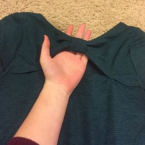 This is a very cute emerald green fit and flare skater dress! It has cap sleeves, and a cutout bow detail in the back. Along the waist it has little loops because the dress originally came with a belt, but those can easily be removed. The dress itself is very comfortable, easy to wear, and is flattering on several body types.