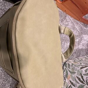 This green backpack features a smooth material and a rounded, bucket-like shape, making it both stylish and practical. The wide opening at the top is complemented by a drawstring closure, ensuring easy access and secure storage. Ideal for everyday use, this backpack combines functionality with a modern design baby diaper bag slightly used but in good condition. Handle stitching coloring is the only thing that looks the most used.