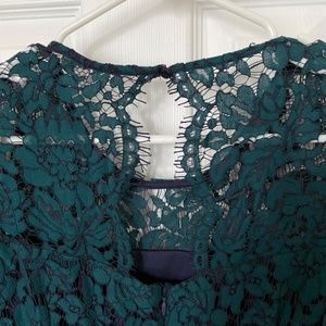 Only worn once to a winter formal. Already dry cleaned! Dark green/blue color. Nice lace overlay and back detail.