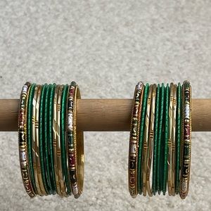 This is a gold and green bagel set with thicker gold bangles with hints of red on the end of each set