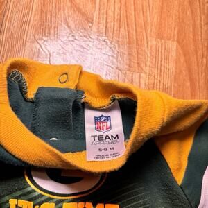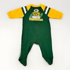 Official NFL Team Apparel Green Bay Packers baby sleeper — size 6-9 months. Features the Packers logo and “It’s Time to Play Packers Football” across the chest in team colors of green and gold. Perfect for keeping little fans cozy on game day!