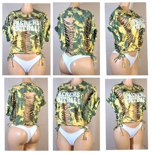 Stylish custom Designed & distressed Packers Football tee. Features green and yellow tie-dye. Short sleeves with side ties. Distressed back design.