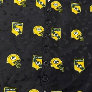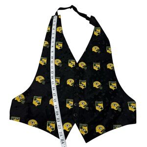 Stylish black vest featuring Green Bay Packers logos. Perfect for fans.