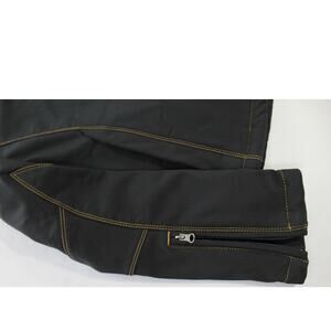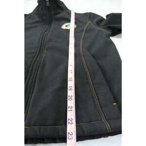 Green Bay Packers NFL Team Apparel women’s softshell jacket in black with yellow stitching accents. Features embroidered Packers logo on the chest and “Packers” lettering on the back. Full zip front, two front zip pockets, and zip sleeve accents. Made from 100% polyester. Women’s size Medium.