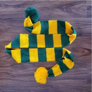 Acrylic hand-made fashion scarf with hand-made pom-poms. Green and gold colors. Great for sports fans!
