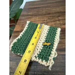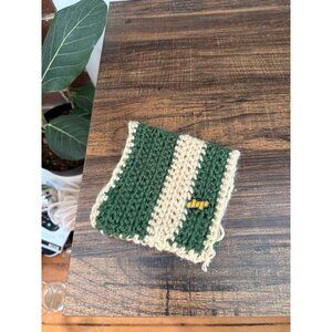 Handmade crochet pouch in striped green and beige design. Comes with a small enamel pin featuring the DIP Devices logo for a unique touch.
