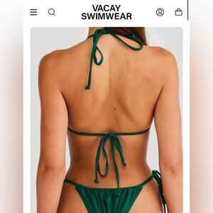 VACAY SWIM emerald green bikini. Top is a small and bottom is a medium. Adjustable due to the side ties, I wanted more coverage on the bottoms so ordered a medium. Already have a swimsuit this color so wanted to sell!