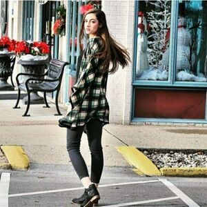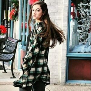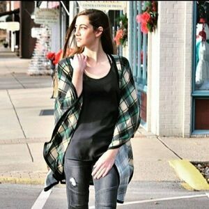 This adorable Green & Black Plaid Poncho/Cape is made of a stretchy material, and has arm holes so it won't slide off your shoulders! Great for chilly days, and is spacious to layer over thicker shirts/sweaters. 100% Polyester. New with tags.
