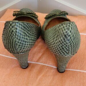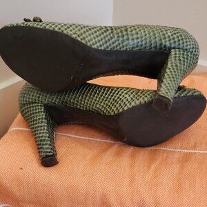 Snakeskin pattern in green and black with a bow on the round toe. All areas of wear are shown in picture.