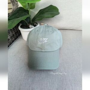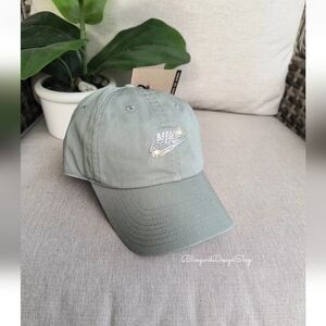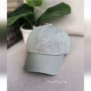 Stylish sage green cap featuring a rhinestone Nike logo. Perfect for casual wear.