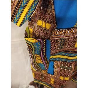 This Green & Blue African Dashiki Tunic is a unique and handmade piece that appears to be crafted with care and attention to detail. With a length of 29 inches, short 11" sleeves and a chest size of 46 inches, this one-size tunic is designed for both men and women who appreciate traditional African clothing. Made from a comfortable cotton blend material, this tunic features a vibrant multi-color design that reflects the rich culture of Africa. Perfect for those looking to add a touch of authenticity and style to their wardrobe, this dashiki tunic is a standout piece that is sure to make a statement.