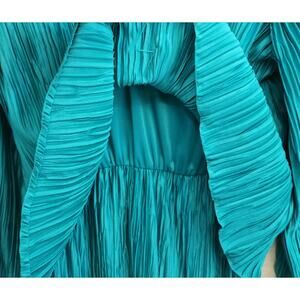 green blue teal, pleated material, V Neck, long sleeves, knee length, formal for wedding, going out or special occasion, pull on, elastic waist, shoulder pads, ruffled hem, A Line, 3 diamond beaded and rhinestone on front bodice, layered look, feels like Satin material