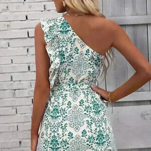Green Boho Women's Floral Print One Shoulder Ruffle Trim Wrap Hem Belted Dress