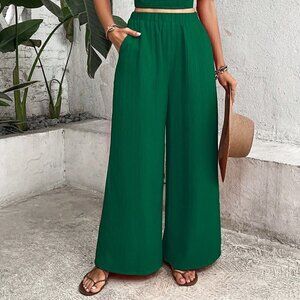 Green Boho Womens Off Shoulder Ruffle Trim Top & Wide Leg Pants