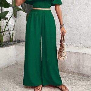 Green Boho Womens Off Shoulder Ruffle Trim Top & Wide Leg Pants