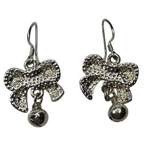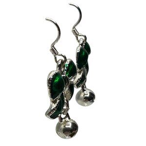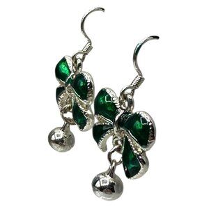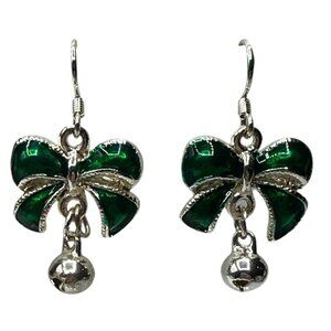 These elegant dangle earrings feature a charming green bow design, and the silver tone defines the shape. It is accented with a bell (which doesn't jingle), offering a playful yet sophisticated look. The silver-tone hook adds an element of classic elegance, making these earrings suitable for various styles. Crafted with attention to detail, they're ideal for those who appreciate unique and stylish accessories.