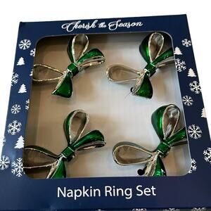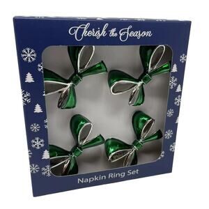 Green Bow Christmas Napkin Rings Set of 4 Silver Holiday Glam Cherish the Season