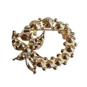 New without tags. Beautiful gold tone brooch featuring faux pearls and green rhinestones in a circular wreath design with butterfly detail. Measures approx. 45mm (1.8 in). Includes free gift box. Secure pin back.