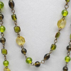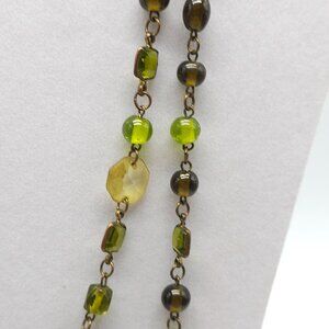 Green Brown Glass Bead Long Necklace With Bronze Chain And Lobster Clasp