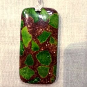 Lovely green and brown stone pendant, with rose shaped silver tone bail.