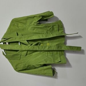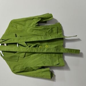 Stylish green jacket with button-up front. Features a matching belt. Perfect for casual or formal wear.