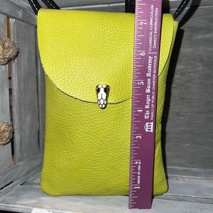 π π Green CHIC Pebble Leather Designer Bag With a Serpent Snakehead Snap Closure. It features a black with white stitching strap and serpent snakehead closure. The bag opens with a snap to a open interior.