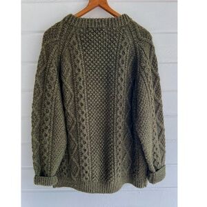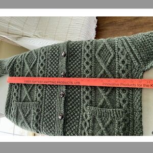 This green cardigan showcases intricate cable knit designs, offering a rich texture and warmth. Made from a thick wool blend, it's ideal for cooler weather, providing a timeless and classic style.