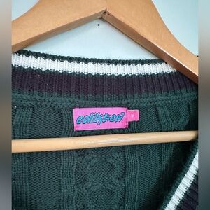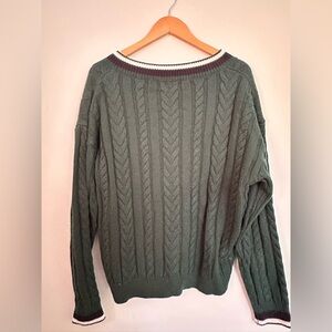 Stay warm and stylish with this green cable knit V-neck sweater. Perfect for any casual outing.