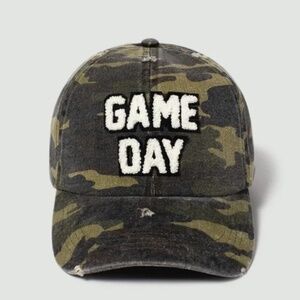 Dark olive green camouflage printed baseball cap with sherpa lettered Game Day detail.