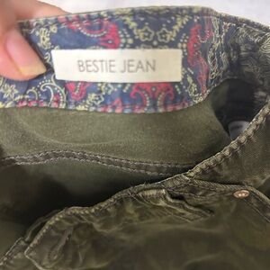 Stylish green camouflage pants with floral embroidery. Perfect for a casual look.