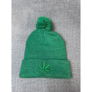 Green Cannabis Leaf Pom Pom Beanie 420 Theme Winter Hat Unisex Adult One Size