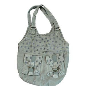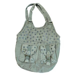 Green Canvas Tote Silver Star Print & Dual Front Buckle Pockets Angels
