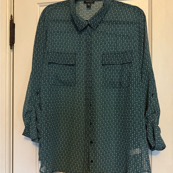This green casual button down shirt is crafted from a lightweight fabric, offering a comfortable fit for everyday wear. Its versatile design makes it an ideal choice for casual outings or relaxed business settings. Tab sleeves. Very good condition. Smoke free home. Size XL.