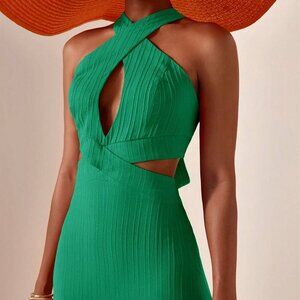 Green Casual Women's Halter Neck Textured Fabric Maxi Dress
