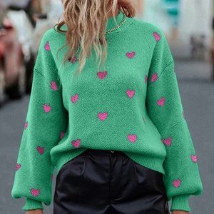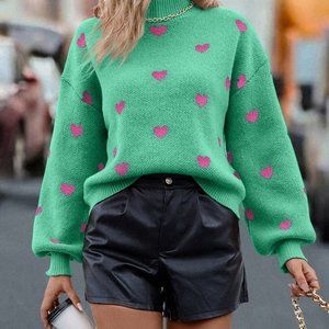 Green Casual Womens Heart Pattern Mock Neck Drop Shoulder Sweater