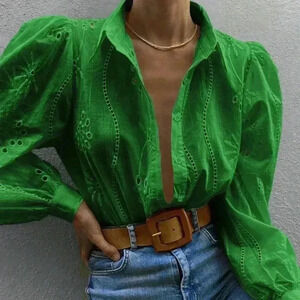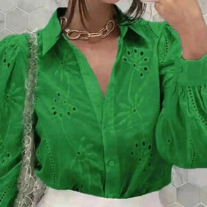 Green Casual Women's Hollow-Out Embroidery Turn-Down Collar Long Sleeve Top