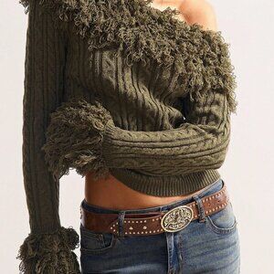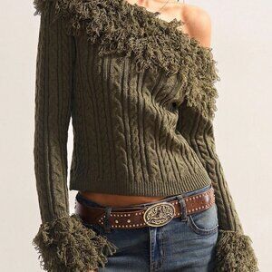 Green Casual Women's Off Shoulder Fuzzy Patchwork Long Sleeve Sweater
