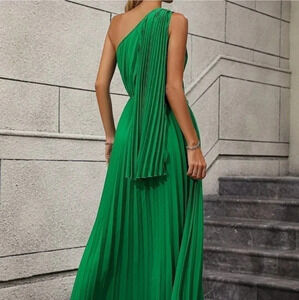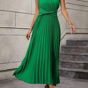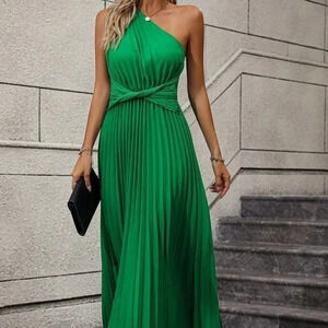 Green Casual Womens One Shoulder Twist Front Pleated Hem Dress