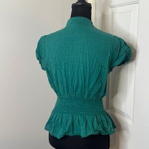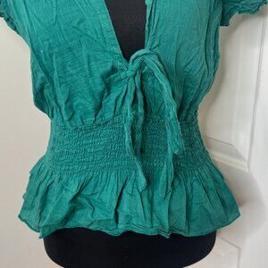 Green Charlotte Russe Blouse, Size Large. I never quite knew how to style this shirt, its cut really deep in the front, but it ties. I always wore another shirt under it but the cap sleeves made it weird to wear a long sleeve under it. Maybe it was what I was trying to pair it with. It has a stretchy accordian style center which is flattering to all body types and a flare under that. This shirt is 100% cotton. If you need flat lay measurements let me know. This is a really pretty shade of green, in my opinion.