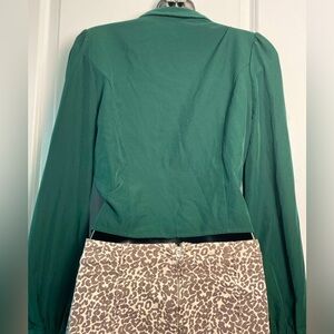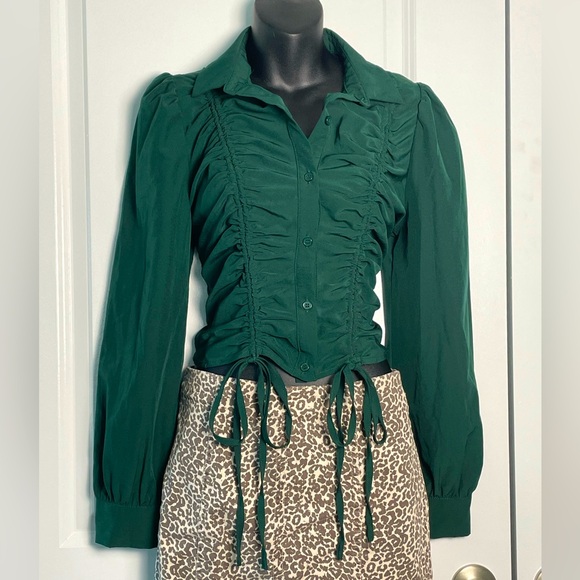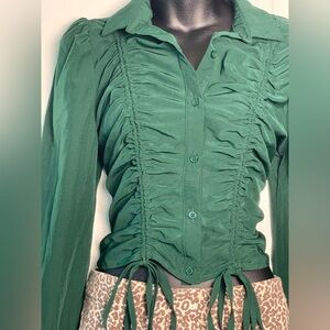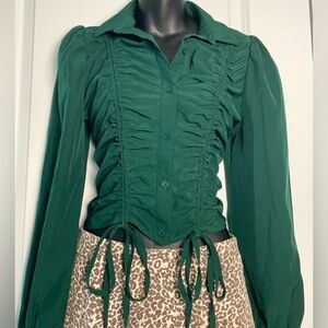 Beautiful button up in dark green with buttons and cinch ribbons to adjust length.
